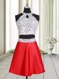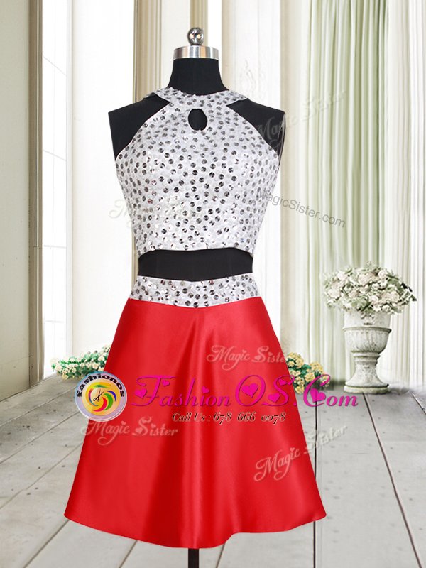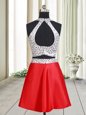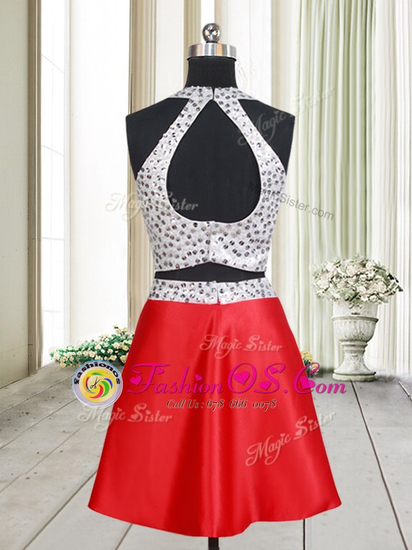 Home >  Prom Dresses >  Fashionable Prom Dresses > Halter Top Criss Cross Satin Sleeveless Mini Length Prom Evening Gown and Beading