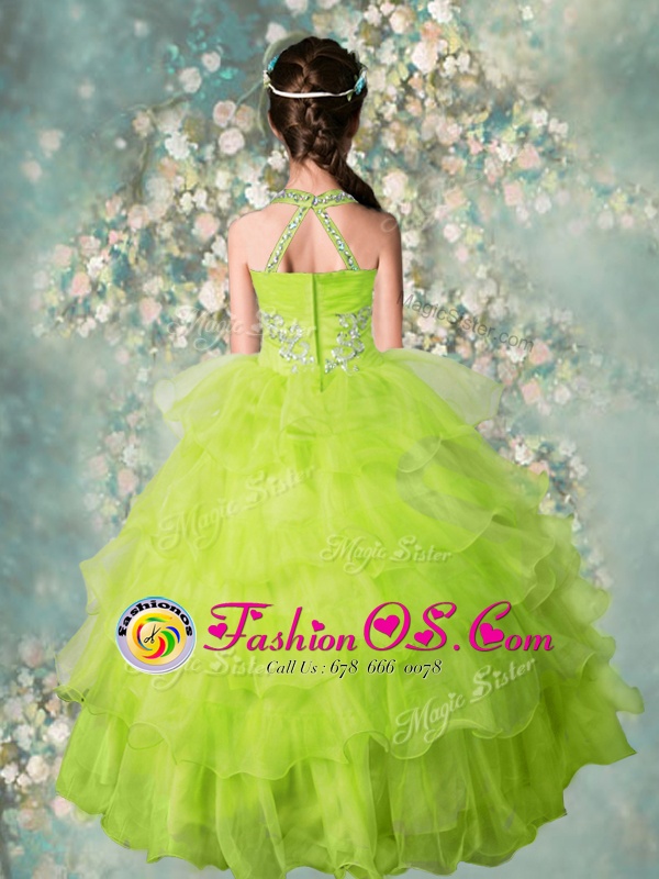 Halter Top Floor Length Zipper Child Pageant Dress Yellow Green and In for Party and Wedding Party with Beading and Ruffled Layers