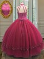 Halter Top Hot Pink Tulle Lace Up Quince Ball Gowns Sleeveless Floor Length Beading and Appliques