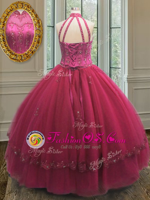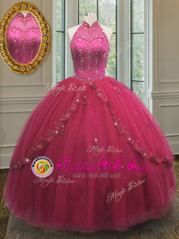Home >  Quinceanera Dresses >  In Stock Quinceanera Dresses > Halter Top Hot Pink Tulle Lace Up Quince Ball Gowns Sleeveless Floor Length Beading and Appliques