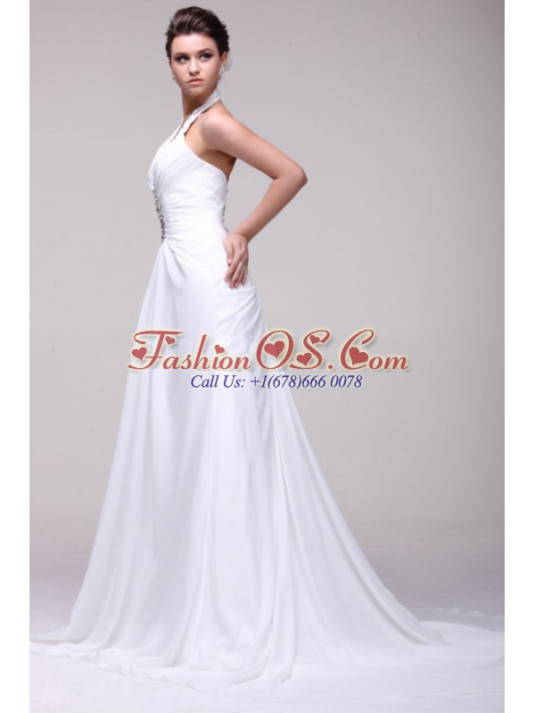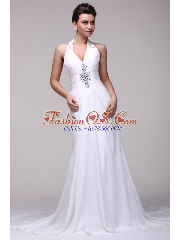 Warning: number_format() expects parameter 2 to be long, string given in /home/fashonos/domains/fashionos.com/public_html/includes/classes/currencies.php on line 52 Halter Top Neck A-line Beading Taffeta Court Train Wedding Dress- HK$