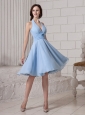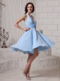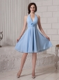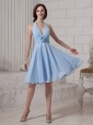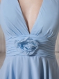 Make an entrance in this sexy and romantic halter-top bridesmaid dress. The skirt is flowy with soft chiffon to your knee. A deep V front shows off your cleavage for a allure look. The pleated waistband is designed with a exquisite hand made flowers on the middle, which do really emphasize your slim figure. Knee-length skirt made from chiffon adds the floating and soft look for the dress.The zipper up back completes the look and hold the dress in places.