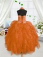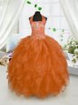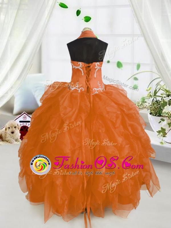 Home >  Special Occasion Dresses >  Mini Quinceanera Dresses > Halter Top Orange Red Sleeveless Beading and Ruffles Floor Length Little Girl Pageant Dress