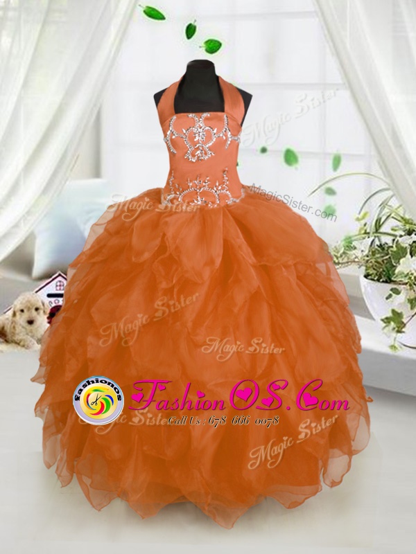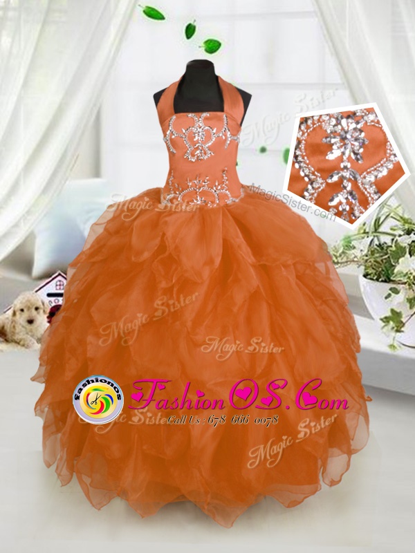 Halter Top Orange Red Sleeveless Beading and Ruffles Floor Length Little Girl Pageant Dress