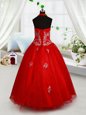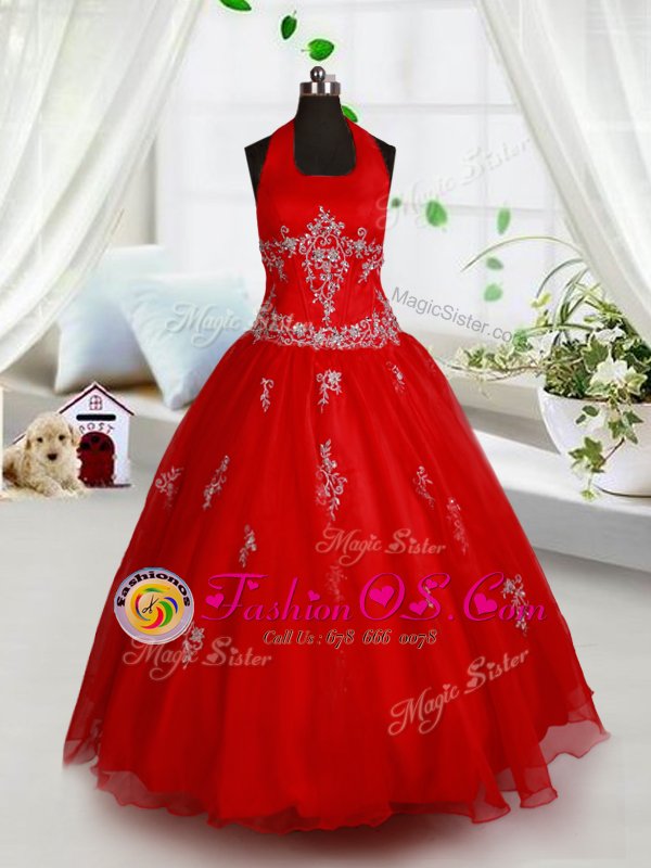 Home >  Special Occasion Dresses >  Mini Quinceanera Dresses > Halter Top Red Organza Lace Up Flower Girl Dress Sleeveless Floor Length Beading and Appliques