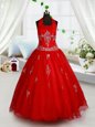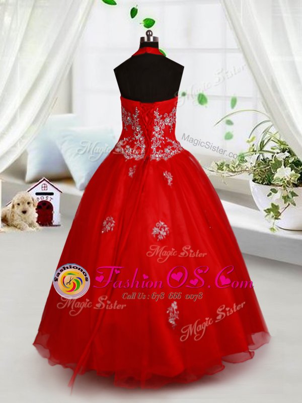 Halter Top Red Organza Lace Up Flower Girl Dress Sleeveless Floor Length Beading and Appliques