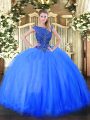Halter Top Sleeveless Brush Train Lace Up Quinceanera Gown Blue Tulle