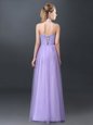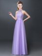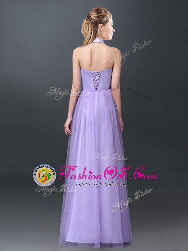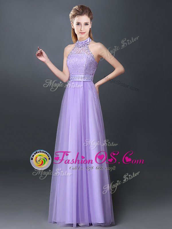 Halter Top Sleeveless Floor Length Lace and Appliques Lace Up Wedding Guest Dresses with Lavender