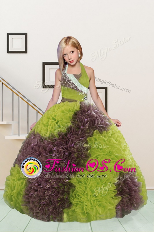 Halter Top Sleeveless Lace Up Floor Length Beading and Ruffles Kids Pageant Dress