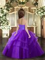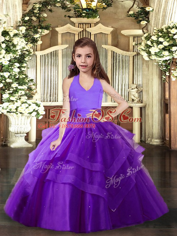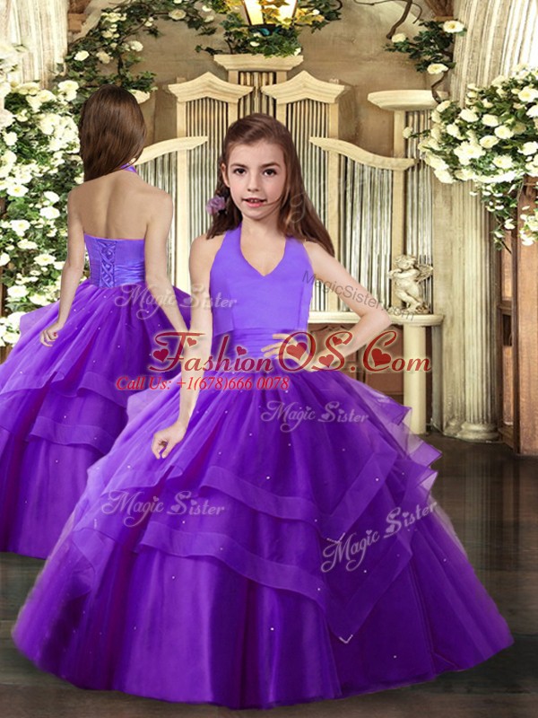 Halter Top Sleeveless Lace Up Little Girl Pageant Gowns Purple Tulle