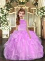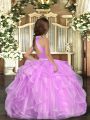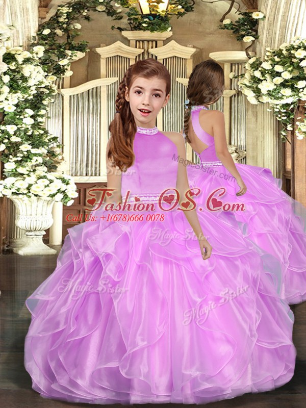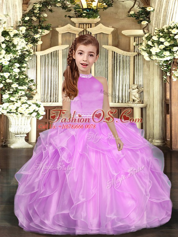 Halter Top Sleeveless Little Girl Pageant Gowns Floor Length Beading and Ruffles Lilac Organza