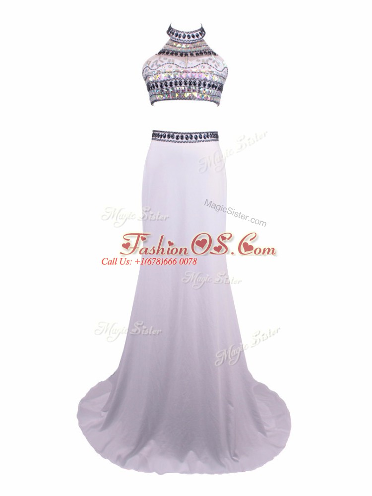 Home >  Prom Dresses >  Prom Dresses On Sale > Halter Top Sleeveless Prom Party Dress Brush Train Beading White Chiffon