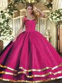 Halter Top Sleeveless Quinceanera Gown Floor Length Ruffled Layers Hot Pink Tulle