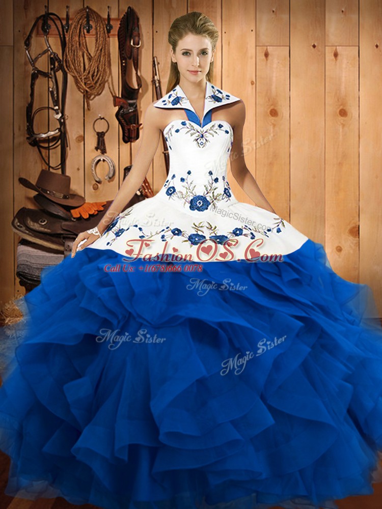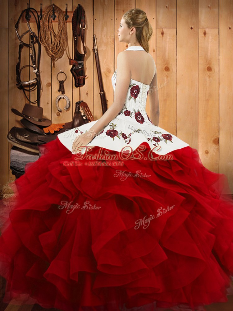 Halter Top Sleeveless Tulle 15th Birthday Dress Embroidery and Ruffles Lace Up