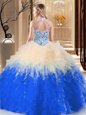 Home >  Quinceanera Dresses >  Perfect Quinceanera Dresses > Halter Top Sleeveless Tulle Floor Length Lace Up Quince Ball Gowns in Blue And White for with Beading and Ruffles