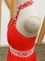 Home >  Prom Dresses >  Christmas Party Dresses > Halter Top Sleeveless Zipper Party Dress Coral Red Chiffon