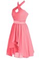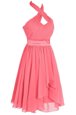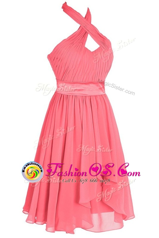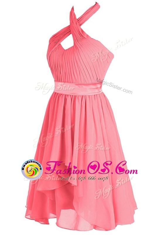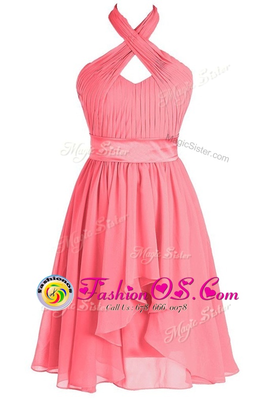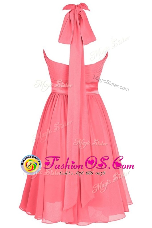 Home >  Special Occasion Dresses >  Homecoming Dresses > Halter Top Tea Length Backless Homecoming Dresses Watermelon Red and In for Prom and Party with Ruching and Belt