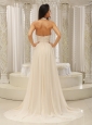 If you're looking for a chic and elegant design for your next event, look no further. This one will definitely suffice. The dress features sleeves with a sexy V-neck and the ruched bodice will highlight your slim figure. The chapel train in the back will accent your temperament. What's more, the open back will show your sexy facet. Zipper up back.