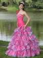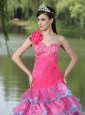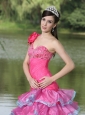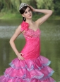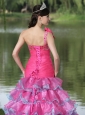 Fun and flirty! A fitted bodice features a beaded one shoulder strap accented with a three-dimensional flower makes it sexy and charming. The crystaled bust and ruching waist curves a flattering pattern.The full accordion pleated skirt creates a beautiful shape to complete the dress. And the big floral embellishments makes is unique.The lace up back finishes the look.