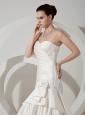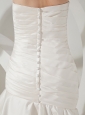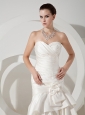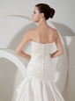 You will definitely look perfect for your walk down the aisle in this graceful wedding gown. This stunning dress is strapless with a sweetheart neckline. Ruched bodice and dropped waist flatter any figure. Gorgeous hand made flowers decorate the waist add the wonderful detail. The skirt has a mermaid shape with tiers of ruffles for a romantic look. Hidden zipper in the back and a row of cute buttons completes the whole look.