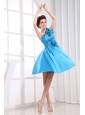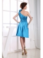 Hand Made Flowers Decorate Bodice One Shoulder Aqua Blue Knee-length Prom Dress For 2013