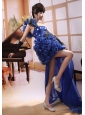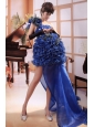 Want to be the center of much attention at your prom? this prom dress will make your dream come true. The hand made flower decorated on one strap to support your shoulder. The straightline neckline annd dotted paillette add some embellishment on the bodice. The swirled organza is crowded to consist of the mini-skirt, which show off your flawless legs and sparky shoes. A sheer, comfortable organza attached on one side to sweep to floor giving a dramatic effect.