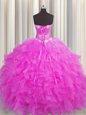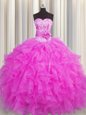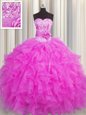 Home >  Quinceanera Dresses >  Fashionable Quinceanera Dresses > Handcrafted Flower Fuchsia Organza Lace Up 15th Birthday Dress Sleeveless Floor Length Beading and Ruffles and Hand Made Flower