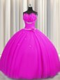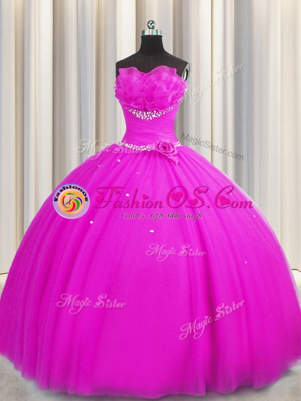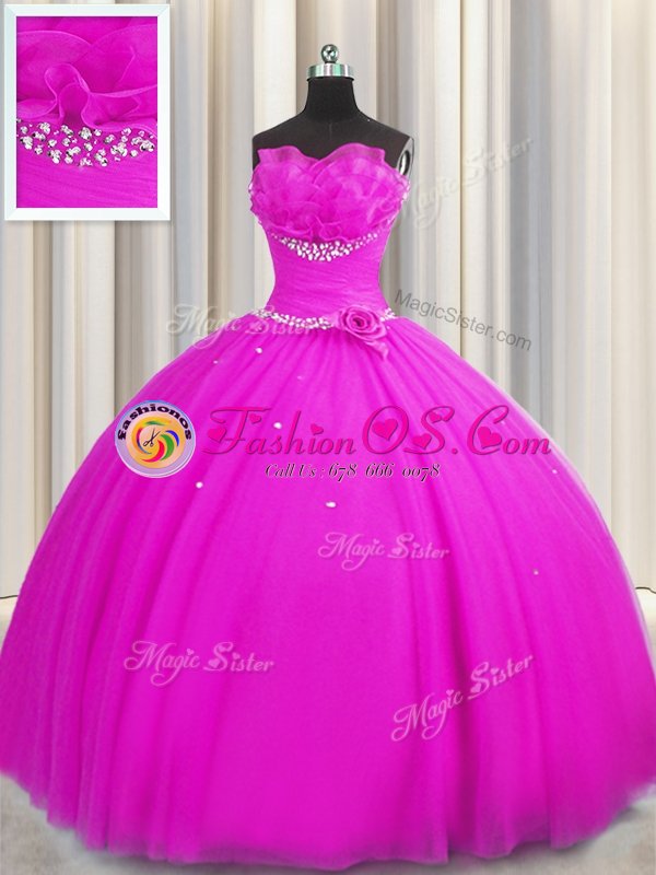 Handcrafted Flower Fuchsia Sweet 16 Dress Military Ball and Sweet 16 and Quinceanera and For with Beading and Sequins and Hand Made Flower Strapless Sleeveless Lace Up
