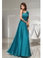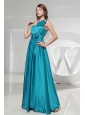 Handle-Made Flowers Elastic Woven Satin One Shoulder Empire Teal Floor-length Formal Prom Dress