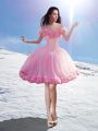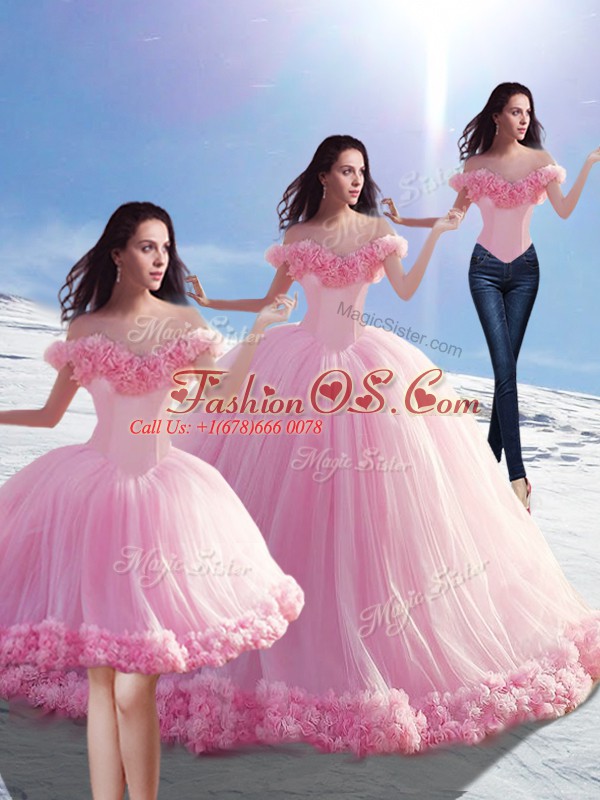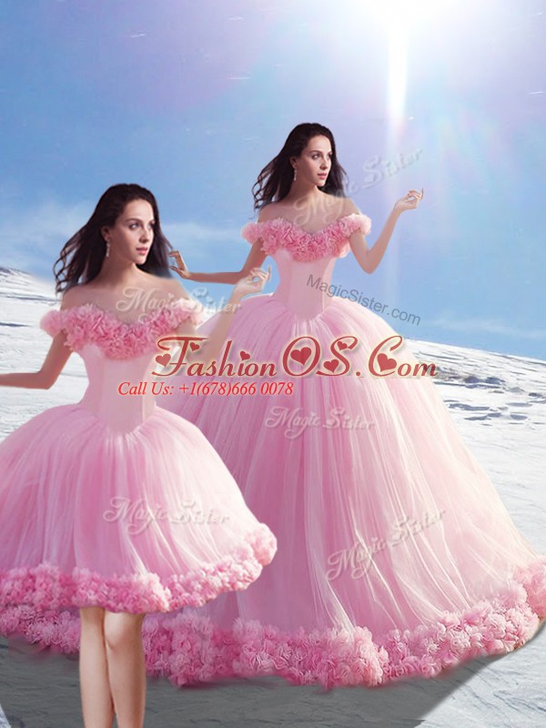 High Class Baby Pink Lace Up Off The Shoulder Hand Made Flower Sweet 16 Dress Tulle Sleeveless Brush Train