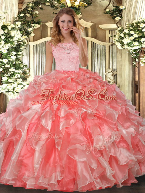 Home >  Quinceanera Dresses >  Best Quinceanera Dresses > High Class Coral Red Scoop Neckline Lace and Ruffles 15th Birthday Dress Sleeveless Clasp Handle