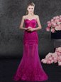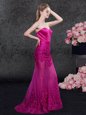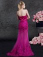 High Class Fuchsia Mermaid Satin and Tulle Sweetheart Sleeveless Lace and Appliques Floor Length Zipper Mother Of The Bride Dress Sweep Train