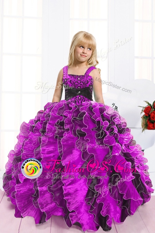 Home >  Special Occasion Dresses >  Mini Quinceanera Dresses > High Class Fuchsia Organza Lace Up Straps Sleeveless Floor Length Little Girl Pageant Dress Beading and Ruffles