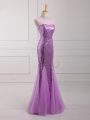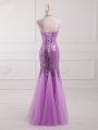 Home >  Evening Dresses > High Class Lilac Mermaid Halter Top Sleeveless Tulle and Sequined Floor Length Lace Up Beading and Sequins Evening Dress
