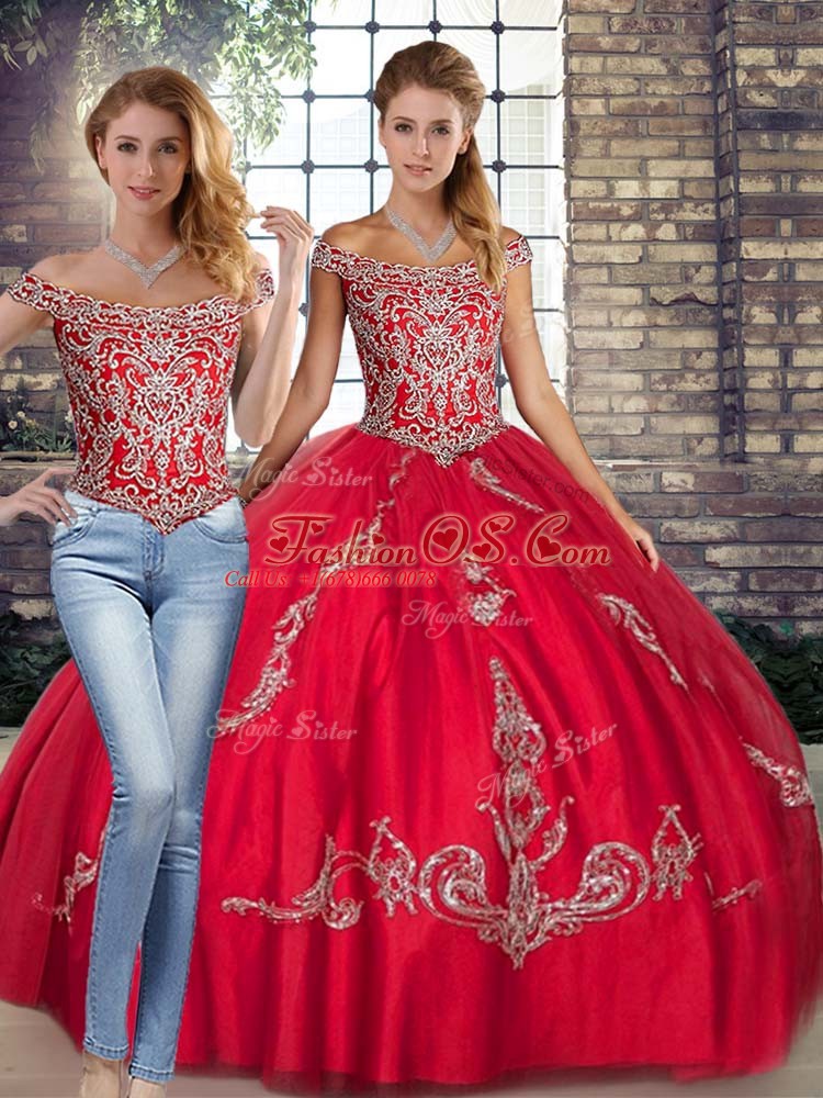 Home >  Quinceanera Dresses >  Detachable Quinceanera Skirts > High Class Off The Shoulder Sleeveless Tulle Ball Gown Prom Dress Beading and Embroidery Lace Up