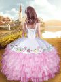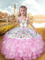 High Class Rose Pink Organza and Taffeta Lace Up Child Pageant Dress Sleeveless Floor Length Embroidery and Ruffled Layers