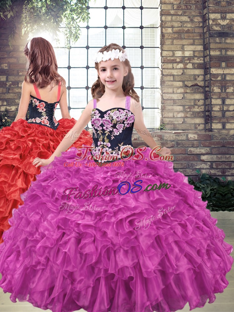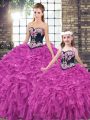 High Class Sleeveless Embroidery and Ruffles Lace Up Sweet 16 Dresses with Fuchsia