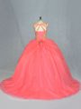 High Class Sleeveless Tulle Brush Train Lace Up 15th Birthday Dress in Watermelon Red with Beading