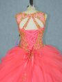 Home >  Quinceanera Dresses >  Perfect Quinceanera Dresses > High Class Sleeveless Tulle Brush Train Lace Up 15th Birthday Dress in Watermelon Red with Beading