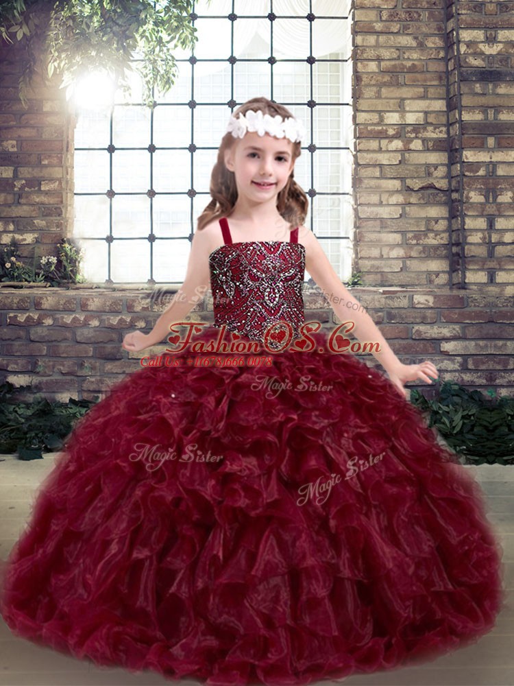 High Class Straps Sleeveless Kids Pageant Dress Floor Length Beading and Ruffles Burgundy Organza