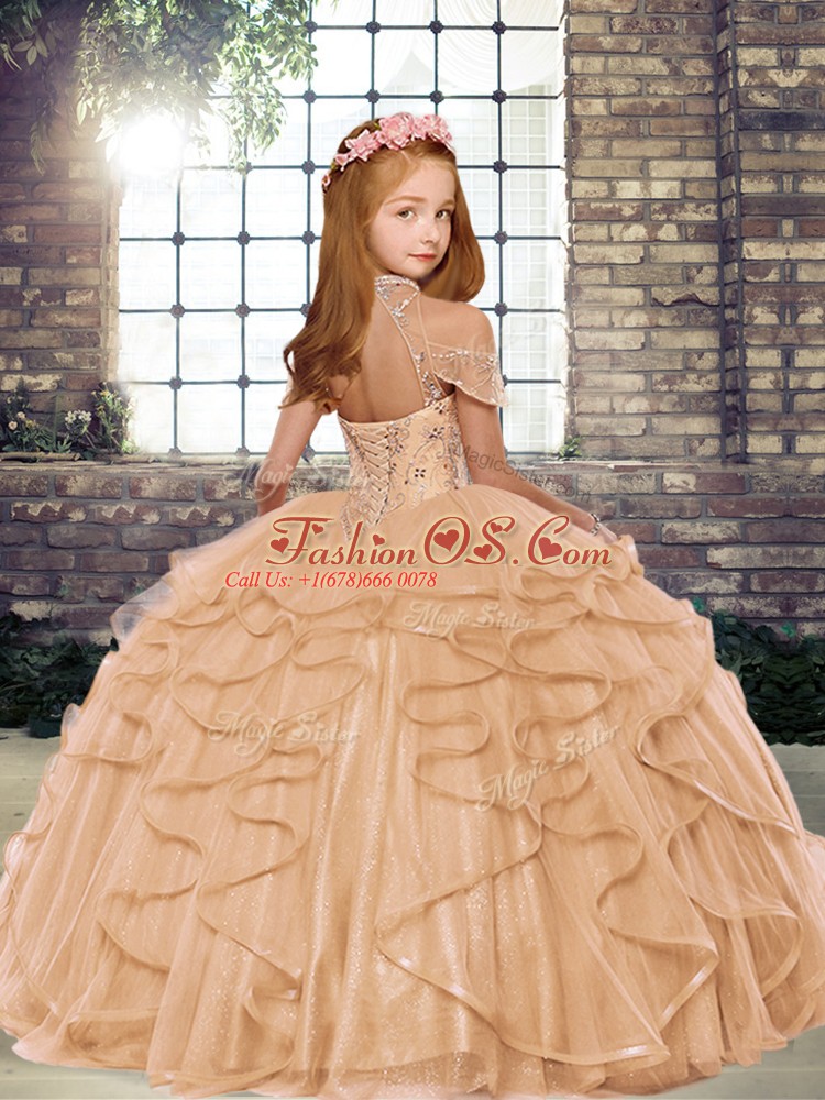 Home >  Special Occasion Dresses >  2018 Little Girl Pageant Dresses > High Class Teal High-neck Lace Up Beading and Ruffles Little Girls Pageant Dress Sleeveless