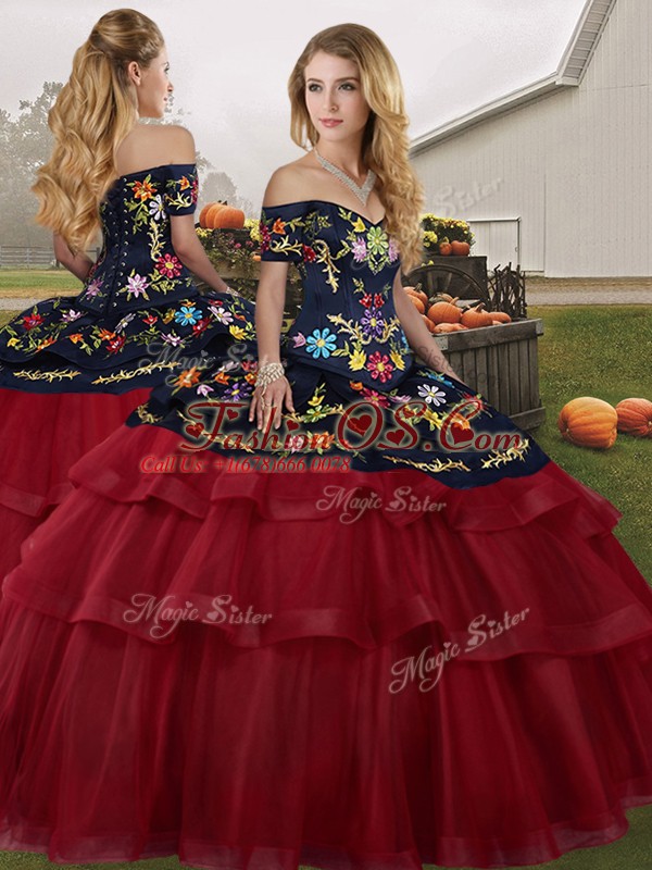 Home >  Quinceanera Dresses >  Detachable Quinceanera Skirts > High Class Tulle Off The Shoulder Sleeveless Brush Train Lace Up Embroidery and Ruffled Layers Quinceanera Gown in Wine Red