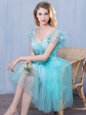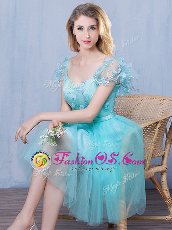 High Class Tulle Sweetheart Short Sleeves Lace Up Lace and Appliques and Bowknot Bridesmaid Gown in Aqua Blue