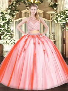 Home >  Quinceanera Dresses >  Best Quinceanera Dresses > High Class Watermelon Red Two Pieces Scoop Sleeveless Tulle Floor Length Zipper Beading Sweet 16 Dress