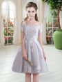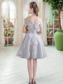 High End Grey Tulle Lace Up Off The Shoulder Short Sleeves Knee Length Dress for Prom Appliques