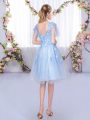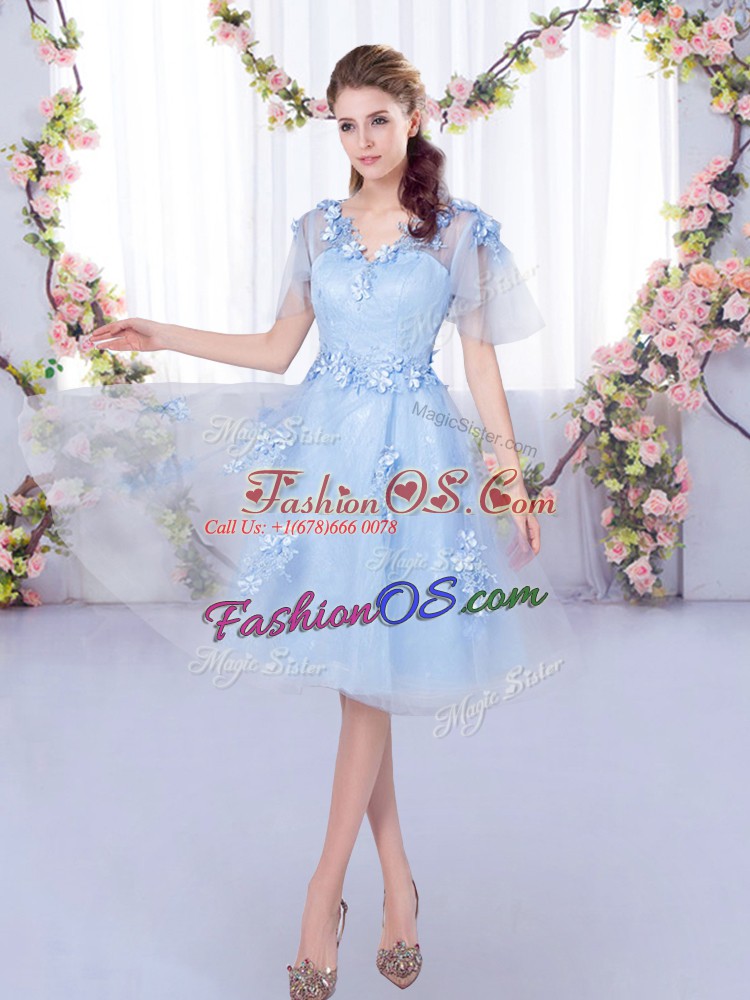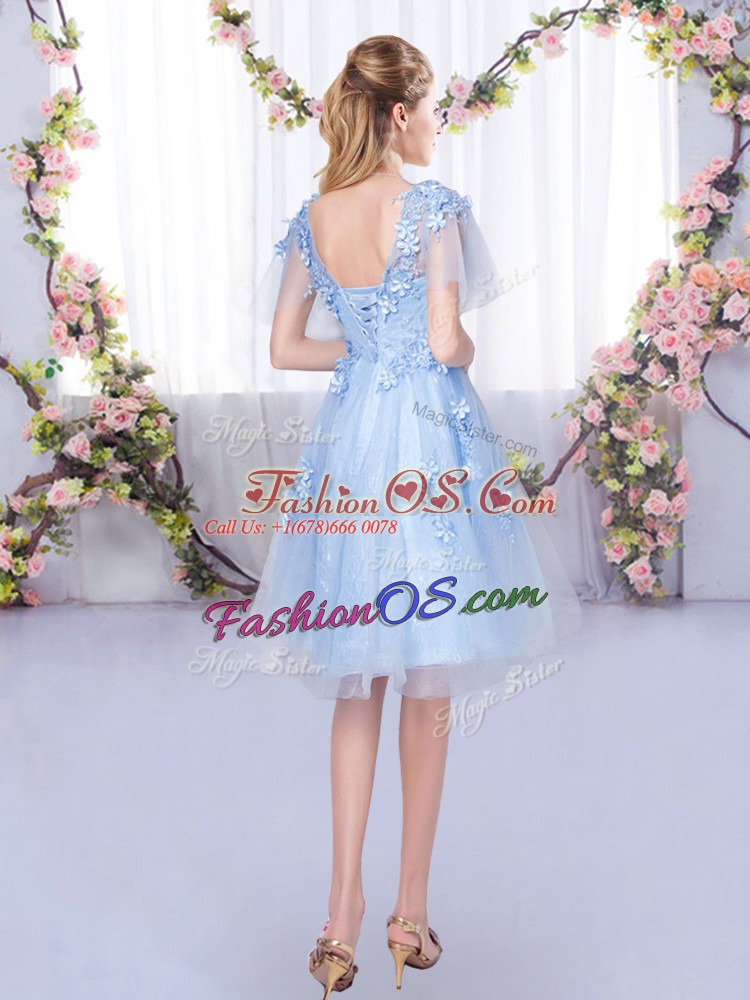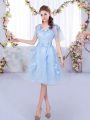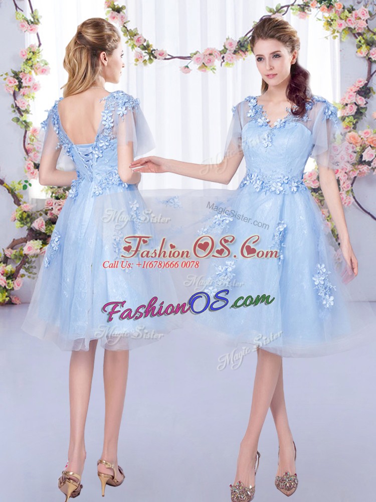 High End Knee Length Light Blue Wedding Guest Dresses V-neck Short Sleeves Lace Up