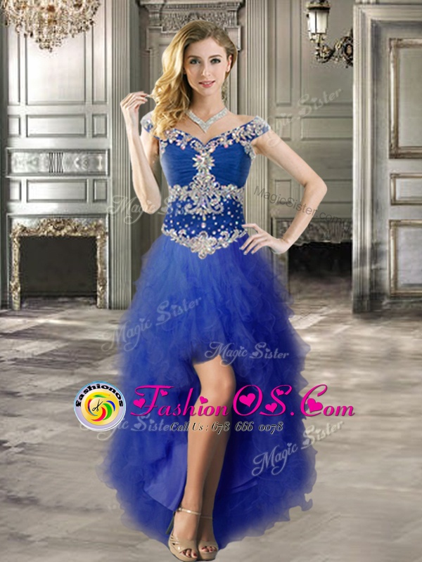 Home >  Prom Dresses >  Perfect Prom Dresses > High End Off the Shoulder Royal Blue Cap Sleeves Tulle Lace Up Prom Dresses for Prom and Party