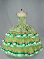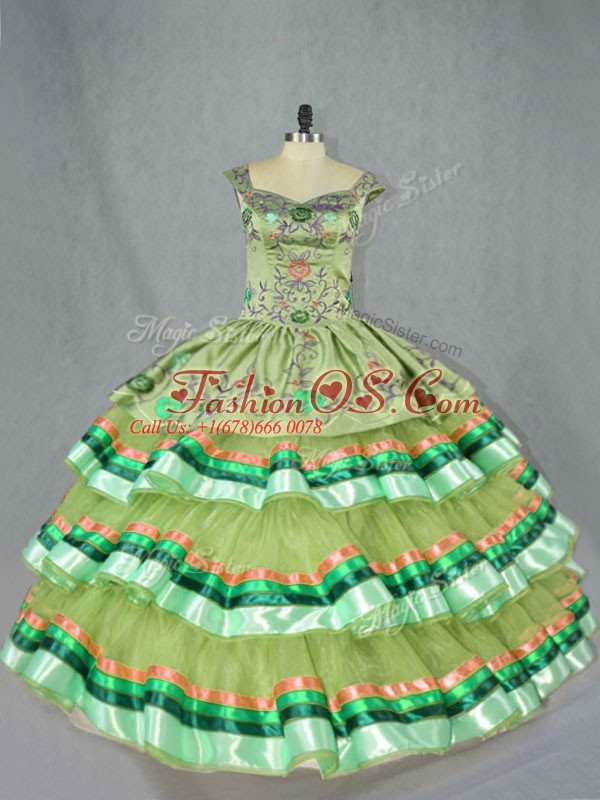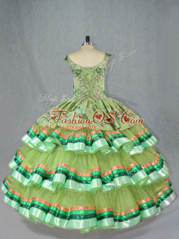 High End Olive Green Ball Gowns Organza Straps Sleeveless Embroidery and Ruffled Layers Floor Length Lace Up Quince Ball Gowns