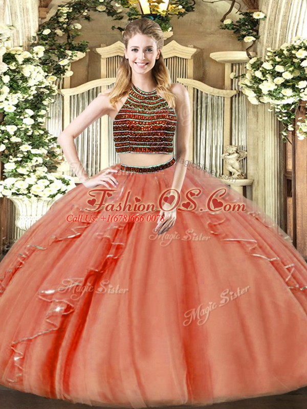 High End Organza Halter Top Sleeveless Zipper Beading and Ruffles Ball Gown Prom Dress in Rust Red