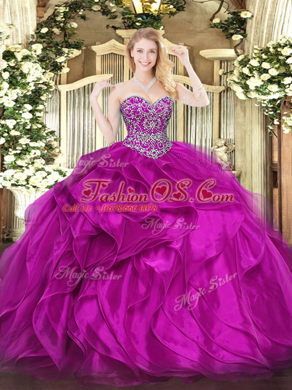 High End Organza Sweetheart Sleeveless Lace Up Beading and Ruffles Ball Gown Prom Dress in Fuchsia